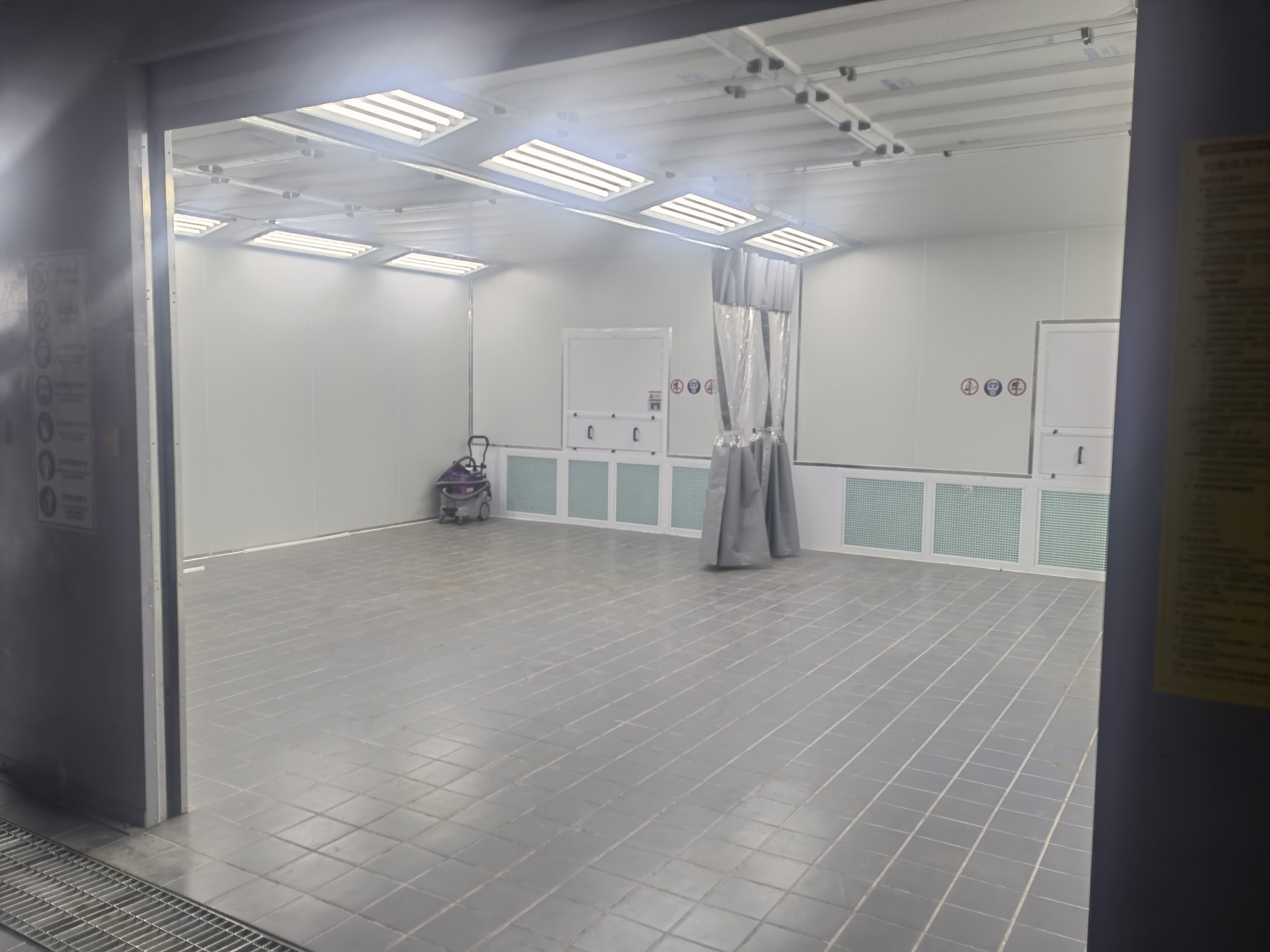 Multi-Stage Filtration: Protects the workshop environment with a 4-stage filter system: Inlet pre-filter, Ceiling high-efficiency filter, Floor fiberglass paint-stop filter, and Exhaust medium-efficiency filter.